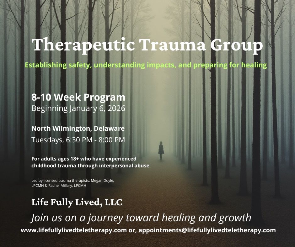 Life Fully Lived, LLC is recruiting adult clients for a new trauma foundations group. This is an 8 week group for adults impacted by interpersonal abuse in childhood. This expressive arts, CBT and psycho-educational group will focus on establishing & building safety, tools, resources and community. Clients will graduate group with the foundation and readiness to more effectively engage in experiential & somatic trauma processing with their own individual clinician